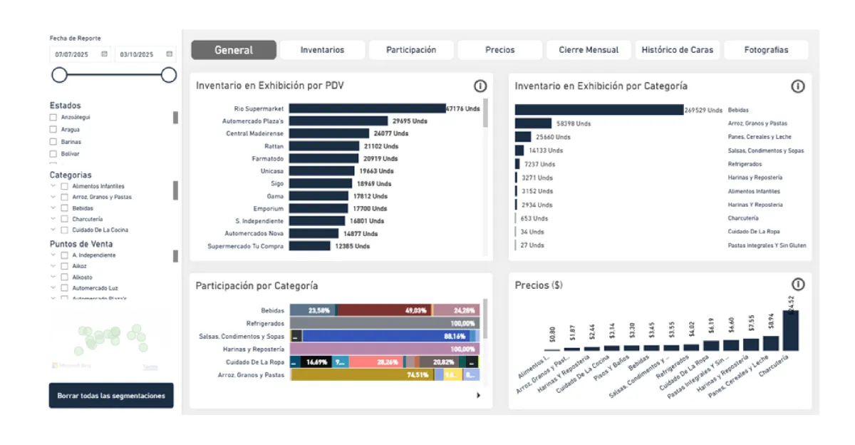 Dashboard incluido: fotos, KPIs, precios, quiebres, exhibiciones.